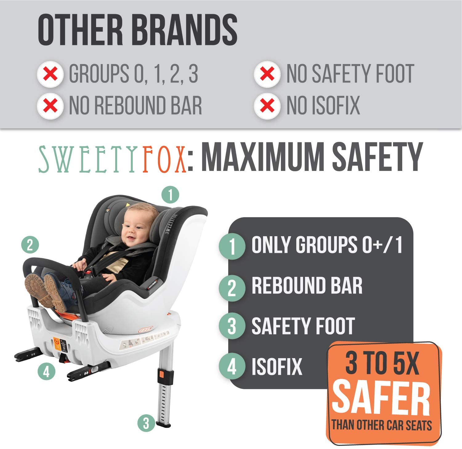 Inoltre, il seggiolino girevole Sweety Fox è dotato di ottimi sistemi di protezione, essenziali per il vostro bambino! Dotato di bretella a cinque punti, di protezioni laterali imbottite per testa e spalle (il tutto comodamente regolabile), questo seggiolino è in grado di garantire al vostro bambino la sicurezza necessaria per affrontare i suoi primi viaggi in auto.